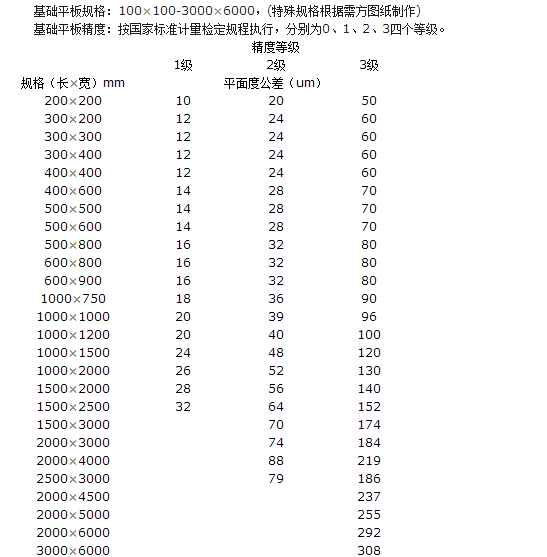 基礎(chǔ)平板材質(zhì):高強度鑄鐵HT200-300工作面硬度為HB170-240,經(jīng)過兩次人工處理(人工退火600度-700度和震動時效)使用該產(chǎn)品的精度穩(wěn)定,耐磨性能好。
